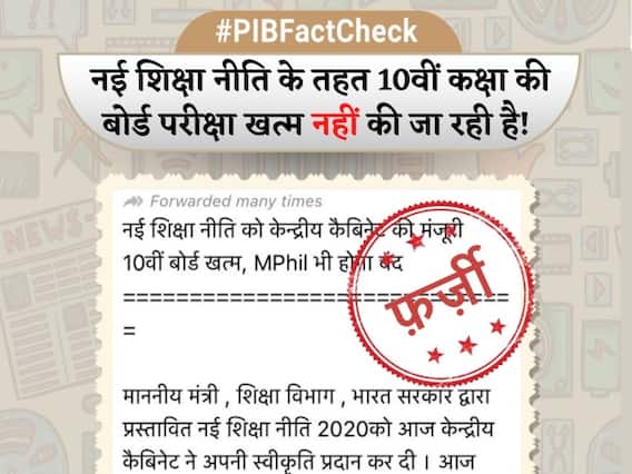 हालांकि, पीआईबी ने इस पर फैक्ट चेक किया है और उसने इस पूरे मैसेज को सिरे से गलत बताते हुए खारिज कर दिया है. पीआईबी ने वायरल मैसेज का स्क्रीन शॉट भी शेयर किया है. उसने #NewEducationPolicy के तहत 10वीं कक्षा की बोर्ड परीक्षा को खत्म करने से जुड़े दावे को फर्जी बताया है. पीआईबी पर सरकार ने स्पष्ट कर दिया है कि नई शिक्षा नीति में 10वीं कक्षा की बोर्ड परीक्षाएँ खत्म करने का कोई प्रावधान नहीं है.